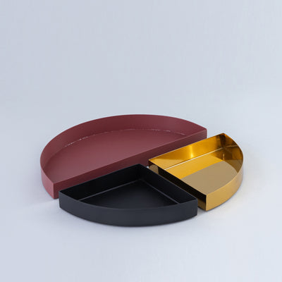 An alternative to the canisters or any type of table organizer is trays. They ensure having no obstacles on the way to grab an item from it. Here are the best round pie-shaped trays to serve a purpose on the table beside your bed. These are made of stainless steel with maroon, black, and gold coating finish. Each tray can be paired with others due to their welcoming shapes or can be separated on the same table to prioritize your stuff. The smooth frictional surface of the tray is easy to use and the design adds a minimalistic touch to among the other accessories in the bedroom.