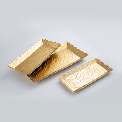 The Gold Rectangle Tray Set of 3 is a luxurious and versatile addition to your decor collection. Crafted from durable iron, these trays exude opulence with their golden finish. This set includes three different-sized rectangular trays, providing practicality and style in one package. Whether used for serving refreshments or displaying decorative items, these trays are perfect for entertaining or adding a touch of elegance to your space. The iron construction ensures durability, while the golden hue adds a touch of glamour to any setting. With this set, you can effortlessly combine functionality and aesthetics, making it an excellent choice for both everyday use and special occasions.