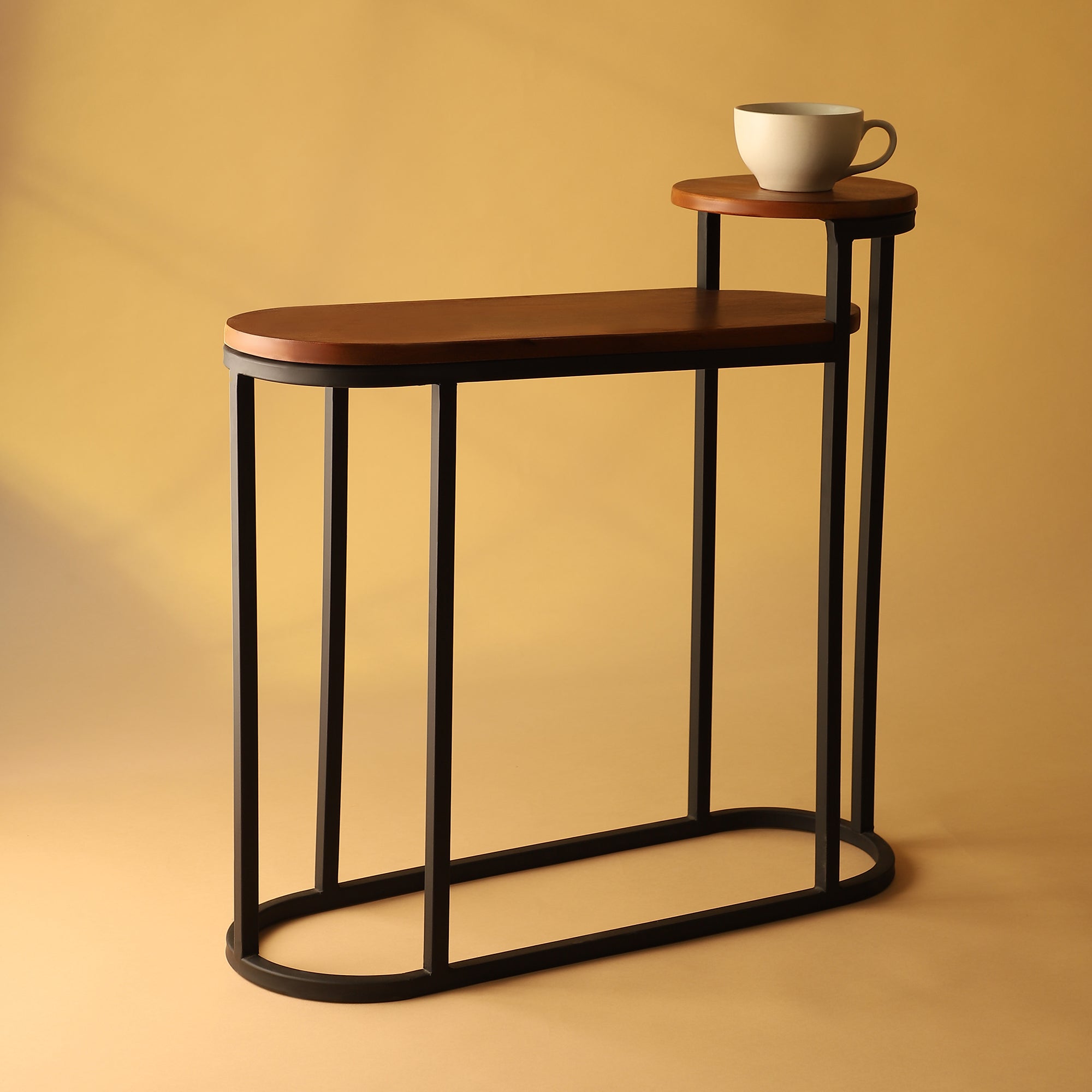The design and craft reflect the simple yet effective craftsmanship. The Iron and Wood table offers different dimensional mantles or table tops to set it to our preferences. This is a natural showpiece that can take any scheme of the room. Place a soothing or motivating piece on the round table top and the articles complementing such on the wide table top to give the overall character.