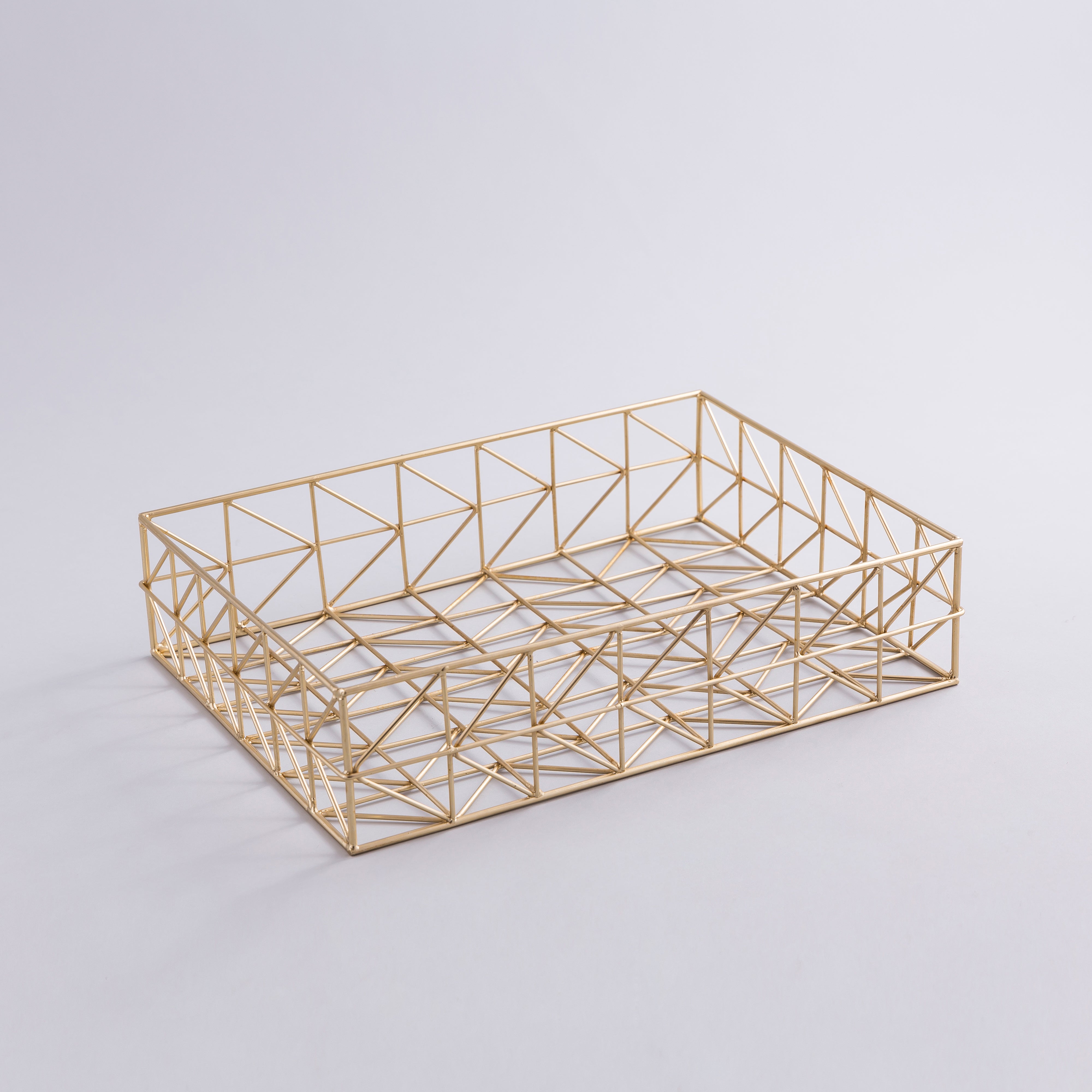 This beautiful geometric iron wireframe desktop organizer with a brass finish can store office supplies, like papers, books, notebooks, and many slim items. It gives your work area a modern look and keeps it mess-free. Clean with a dry or damp cloth.