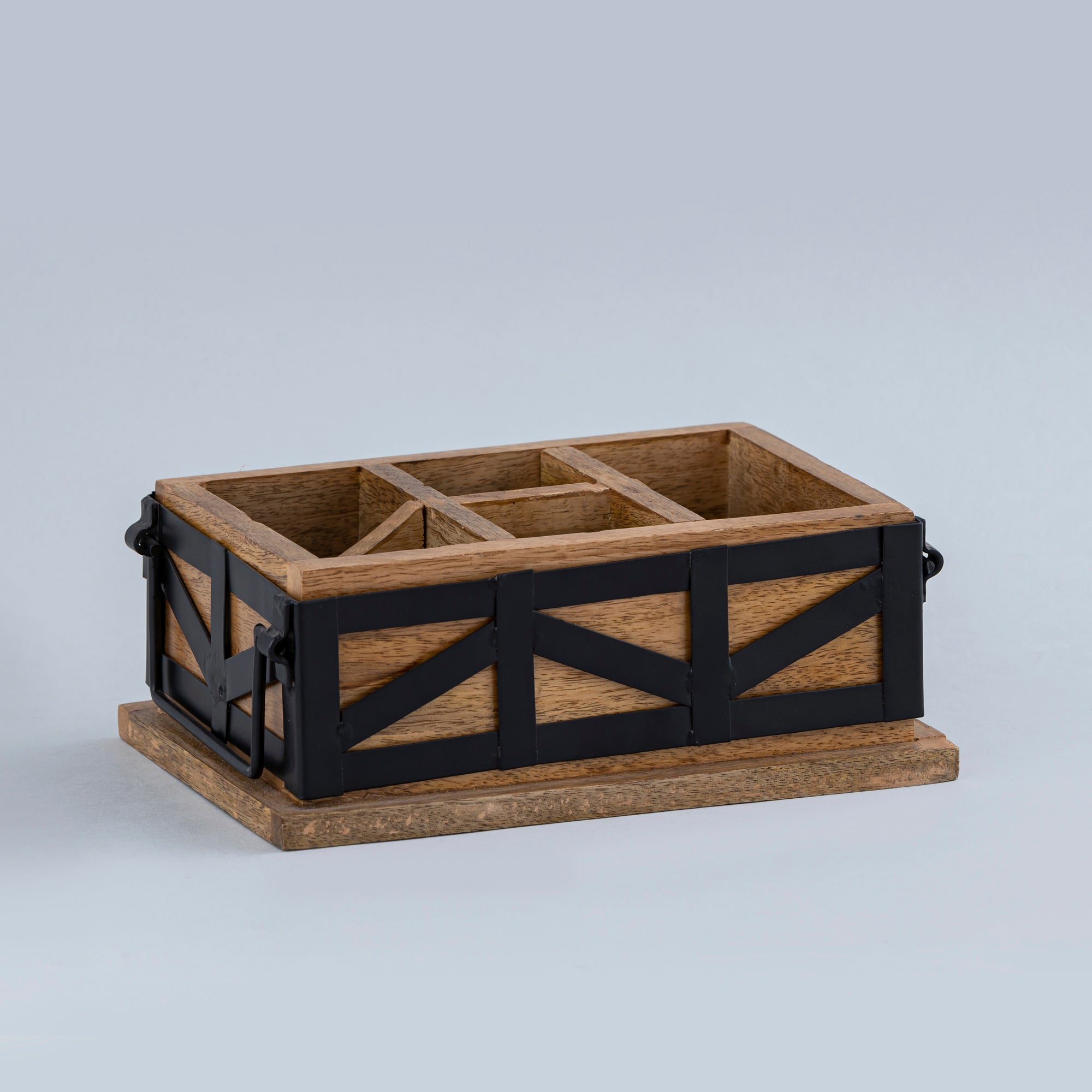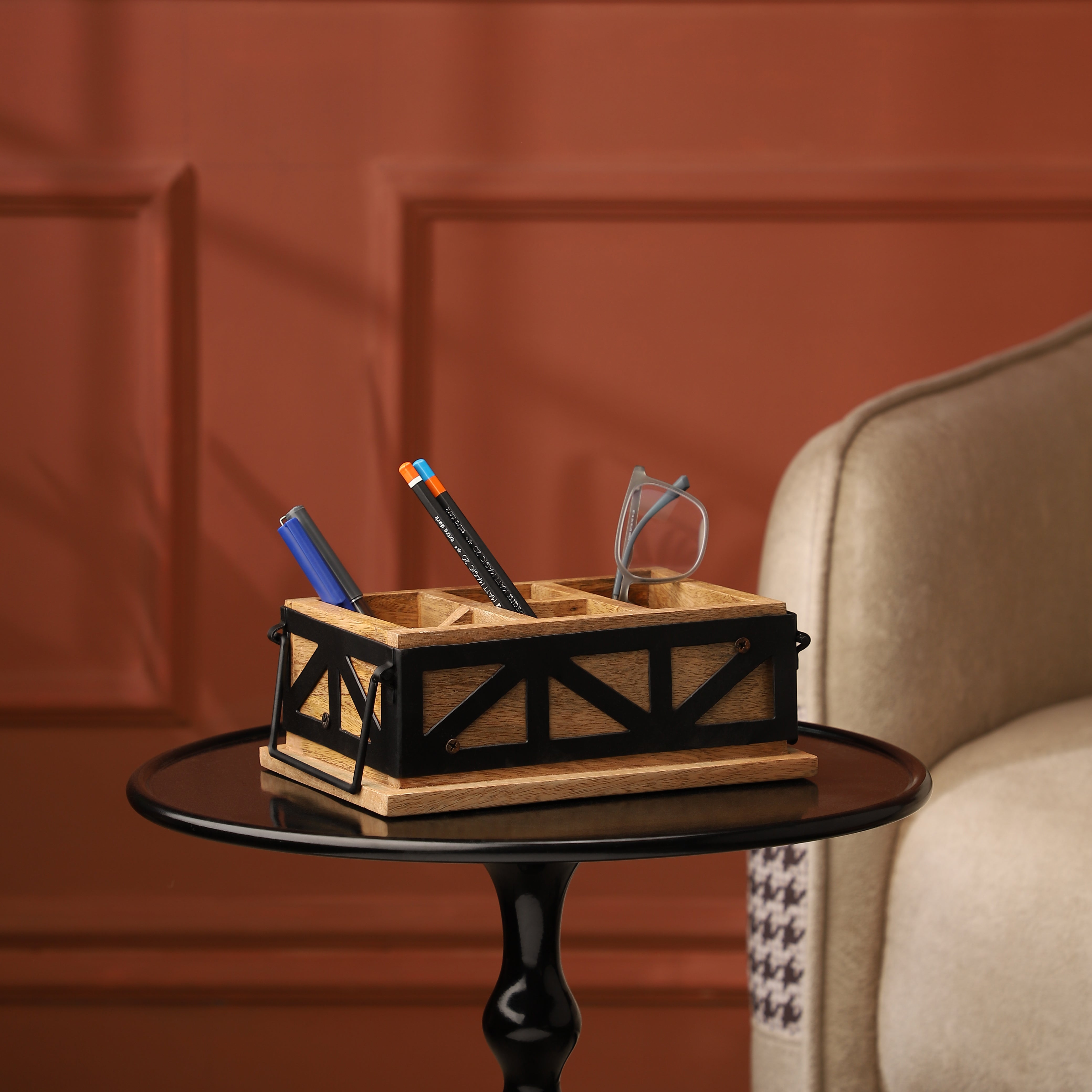 This beautiful wooden table organizer has a stylish design with matt black iron finish on natural wood polish.With this, you can tidy up your messy desks. It has the shape of a rectangular open box with five separate sections for things.You can easily place it on your office desk. Use it in the study room for holding your simple stationery items and reorder them in a small compact space.