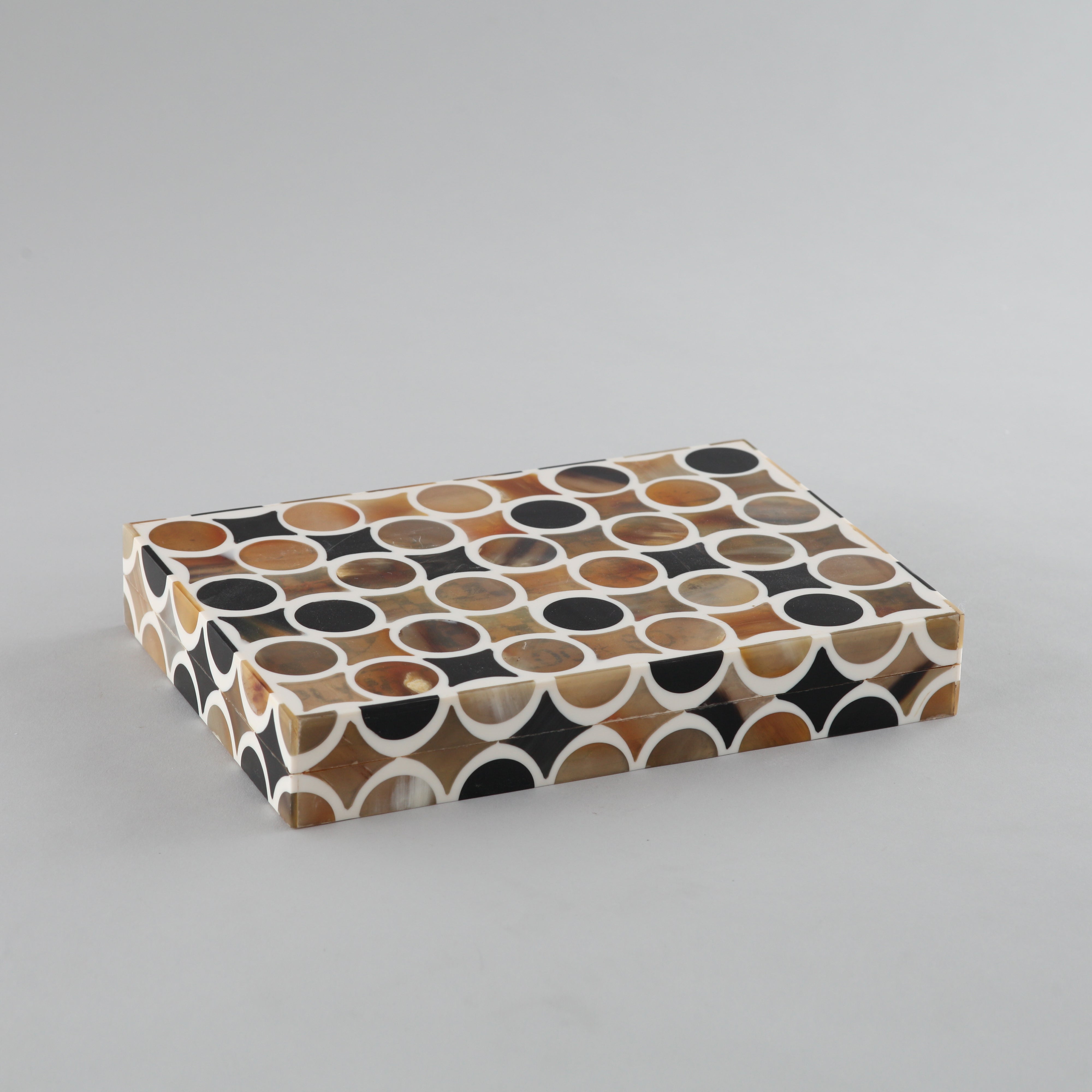 This modern bone trunk box with a colorful geometric pattern is apt for storing several day-to-day use items and keeps your room clutter-free. Add a unique feel by gifting it to your loved ones on their special occasion. Wipe clean only.